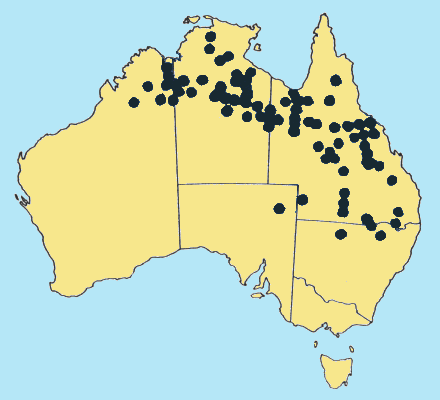 Distributed from the Kimberley region of W.A. across the northern part of the