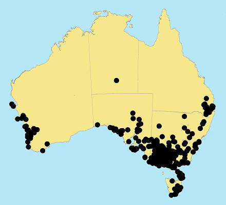 Australian Distribution: Western Australia, Northern Territory, South Australia, Queensland, New South Wales, Victoria, Tasmania, Norfolk I, Lord Howe.