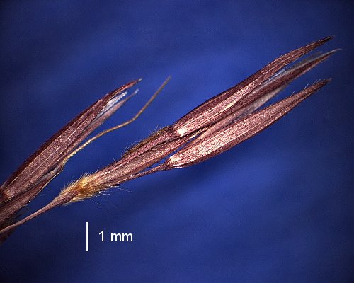 Fertile lemma 4–6 mm long, without keel, 3 -nerved. Lemma apex dentate, awned, 1 -awned. Median (principal) awn from a sinus, 4–7 mm long overall, with a straight or slightly twisted column. Palea 0 -nerved, without keels. Anthers 3.