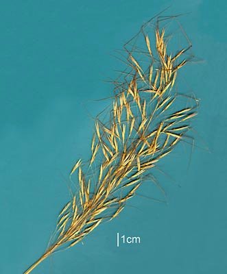 Fertile lemma 4.5–5 mm long, without keel. Lemma apex dentate, awned, 1 -awned. Median (principal) awn from a sinus, 37–43 mm long overall, with a twisted column. Palea 0–2 -nerved. Anthers 3. Grain 3–5 mm long.