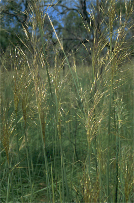 Habit. Perennial. Culms erect, 100–150 cm tall, 3–5 -noded. Lateral branches sparsely branched. Leaf-sheaths smooth or scaberulous, glabrous on surface or hairy. Ligule a fringe of hairs, 0.5–0.7 mm long. Leaf-blades conduplicate or convolute, 20–40 cm long, 3–6 mm wide. Leaf-blade surface papillose, glabrous or indumented.