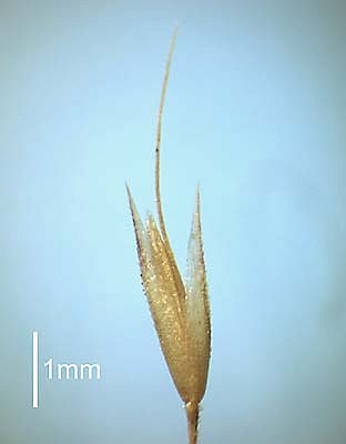 Florets. Fertile lemma 4.5 mm long, without keel, 5 -nerved. Lemma apex dentate, awned, 1 -awned. Median (principal) awn dorsal, 5 mm long overall, without a column. Lodicules present. Anthers 3.