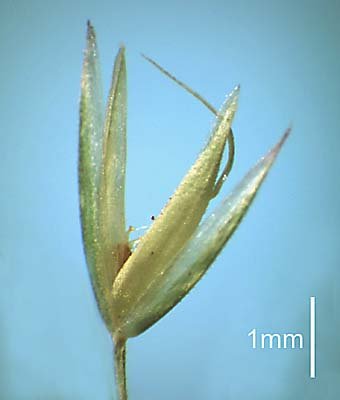 Florets. Fertile lemma 3–5 mm long, without keel, 5 -nerved. Lemma apex entire or erose, awned, 1 -awned. Median (principal) awn dorsal, 4–5 mm long overall, with a straight or slightly twisted column or with a twisted column. Lodicules present. Anthers 3.