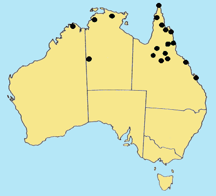 scattered occurrences in the Kimberley, W.A. and N.T. Also in the Philippines,