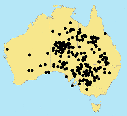 in arid and semiarid parts of all mainland states except Vic. Usually in sandy