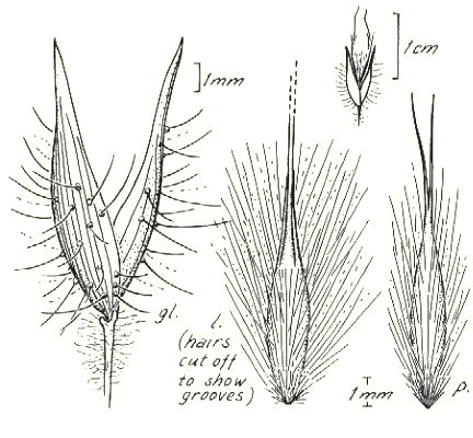 indumented. Lemma apex awned, 1 -awned. Median (principal) awn 4–10 mm long