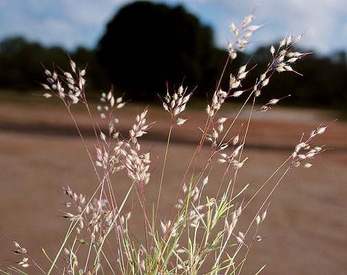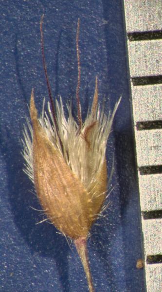 awned lemmas, entirely pubescent (on body) palea, and flattened dark caryopsis.