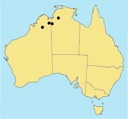 Central and NE Kimberley region of W.A., and N.T. Occurs in skeletal, stony