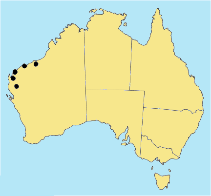 Endemic. W.A. and restricted in area. Seaward face of foredune and red sand