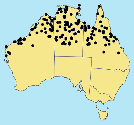 N of 24ºS in Qld, N.T. and W.A. (predominantly N of the Tropic of Capricorn);