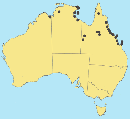 N of 22ºS in Qld, N.T., and extending slightly into W.A., commonly on islands