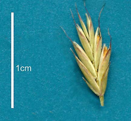 Florets. Fertile lemma 4–6.4 mm long, without keel or keeled, 5 -nerved. Lemma apex awned, 1 -awned. Median (principal) awn 0.5–3.4 mm long overall. Palea 2 -nerved. Anthers 3.