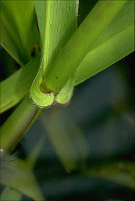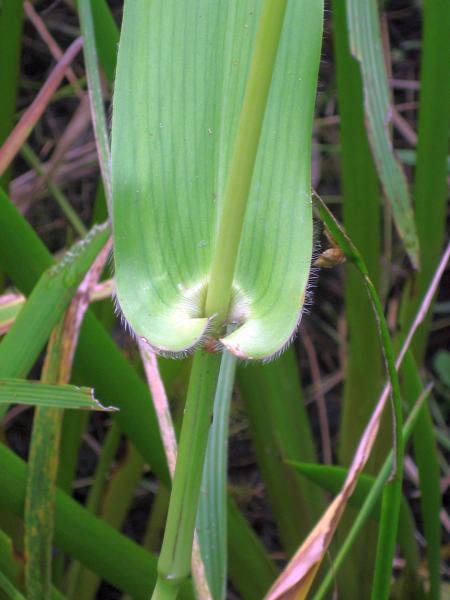 Habit. Perennial. Culms decumbent, stature robust to moderate, 200–350 cm tall, spongy. Mid-culm internodes solid. Mid-culm nodes glabrous. Leaf-sheaths glabrous on surface. Ligule an eciliate membrane, 1–2.5 mm long. Leaf-blades lanceolate, 15–33 cm long, 12–28 mm wide. Leaf-blade surface glabrous.