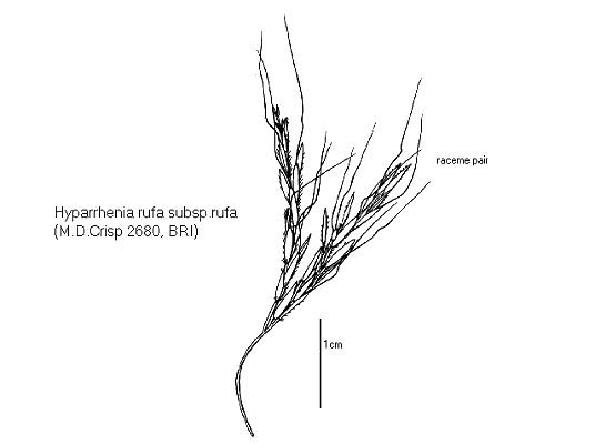 Hyparrhenia rufa subsp. rufa* Australian Distribution: Queensland. Notes. An African savanna species introduced to Australia, where it occurs in coastal areas of central and southern Qld. Flowers Feb.--Aug. Taxonomic name: Hyparrhenia (Australian Grasses) Add new comment