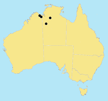 in sandy loam. Rare in the tropical W.A.- N.T. border region. Flowers Mar.