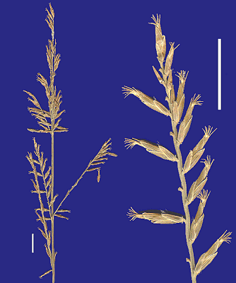 Florets. Fertile lemma 5.3–6.5 mm long, keeled, 7–13 -nerved. Lemma apex awned, 1 -awned. Median (principal) awn 1–1.5 mm long overall. Palea 2 -nerved. Palea apex dentate. Lodicules present. Anthers 2.
