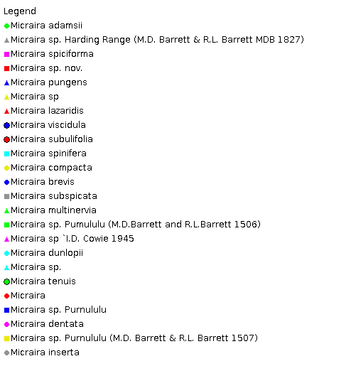 Notes. With the exception of M. subulifolia, which is confined to Queensland, all the species are distributed in a relatively small area of the Northern Territory and Western Australia. Characteristically plants of the species grow in localised colonies in highly specific habitats. The genus is notable for prominent features such as spiral phyllotaxy, mat-forming habit, and an unusual 2-keeled and many nerved or nerveless palea which is usually divided into 2 equal parts. A noteworthy physiological feature is the ability of plants to revive after dehydration (i.e. they are resurrection plants). M. subulifolia is isolated in terms of morpholgy, distribution and ecology (Lazarides, 1985). The genus is isolated from all others taxonomically and may deserve placement in a separate subfamily. However, pending futher analyses, they are presently placed as Incertae Sedis (Kellogg, pers. com.).