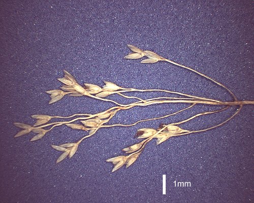 Spikelets. Spikelets pedicelled. Fertile spikelets 2-flowered, both fertile, comprising 2 fertile floret(s), without rachilla extension, oblong, laterally compressed, 1 mm long.