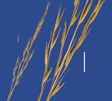 Florets. Fertile lemma 8–12 mm long, without keel, 3 -nerved. Lemma surface indumented. Lemma apex lobed, awned, 1 -awned. Median (principal) awn from a sinus, 50–60 mm long overall. Palea 2 -nerved. Lodicules present. Anthers 3.