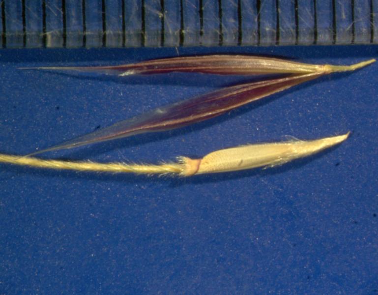Florets. Fertile lemma 7–11 mm long, without keel, 5 -nerved. Lemma surface indumented. Lemma apex entire, awned, 1 -awned. Median (principal) awn 40–85 mm long overall, with a twisted column. Column 25–55 mm long. Palea without keels. Anthers 3.