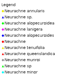 Notes. Neurachne, Paraneurachne and Thyridolepis are traditionally placed in an endemic Australian tribe the Neurachneae (Blake, 1972). However recent cladistic work based on morphological characters (Zuolaga, Morrone and Giussani, 2000) reveal that Neurachneae is not monophyletic, and the three genera are placed widely among the Paniceae in the cladogram (B.K.Simon).