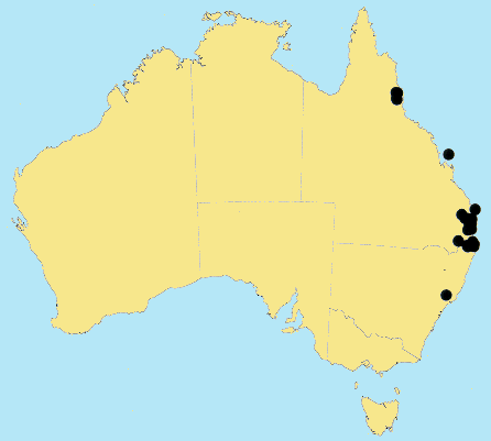 forested areas of SE Qld and NW N.S.W. Flowers Feb.-Aug.