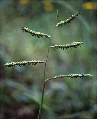 dilatatum has larger spikelets, fewer primary branches, a shorter main axis