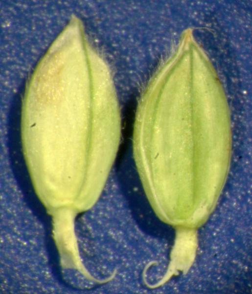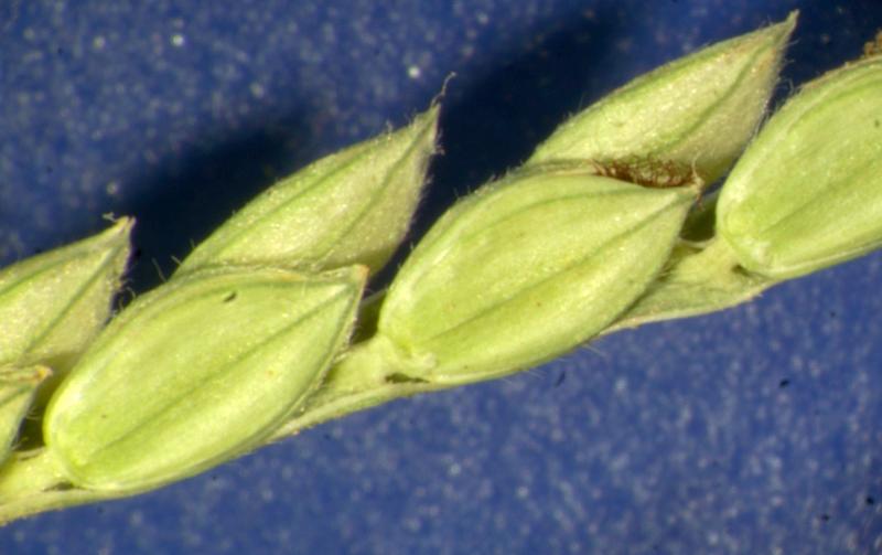glume and texture of the lower lemma and upper glume. Prefers moist ditches or