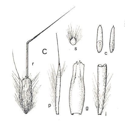 Column 8.5–11 mm long. Palea absent. Grain 2.3–3.5 mm long.