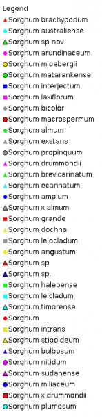 Notes. The taxa of agricultural importance are closely related to S. arundinaceum, and form a complex whose many variants have attracted a deluge of specific names, which have been reduced with greater cytogenetic understanding (Clayton and Renvoize, 1986). The genus has been subdivided into subgenera by Garber (1950), and recent cladistic work by Spangler (in press), based on molecular and morphological data, recognises 3 genera, Sorghum, Sarga and Vacoparis..