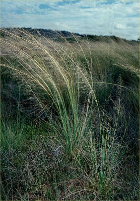Habit. Perennial. Culms erect, 80–120 cm tall, 2–4 -noded. Mid-culm internodes glabrous. Mid-culm nodes glabrous. Lateral branches simple. Ligule a fringe of hairs, 0.5 mm long. Leaf-blades filiform, involute, 14–35 cm long, 1–1.5 mm wide.