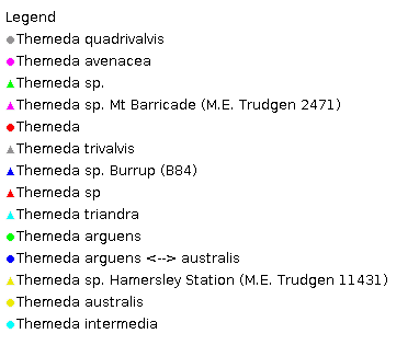 Notes. The genus is clearly related to Heteropogon though the nature of the inflorescence is not always easy to perceive as the racemes are much modified and often compacted into dense clusters. The sessile spikelet is normally shed in the usual way, but in two species the whole raceme is deciduous with the sessile spikelets still attached. Themeda is distinguished from Iseilema by the homogamous pairs being separated by a short internode (Clayton and Renvoize, 1986).