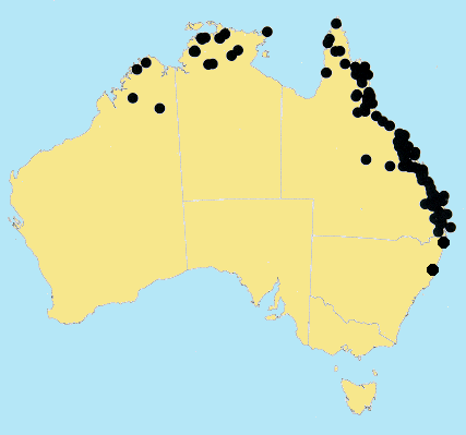tropical coastal Qld with a few records from N.T. and W.A. Flowers Feb.--Oct.