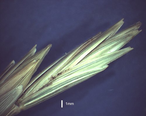 Fertile lemma 11–20 mm long, keeled, 5 -nerved. Lemma apex mucronate. Palea 2