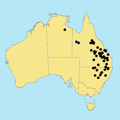 N.S.W. and one record from NE N.T. Shallow often stony soils on hillslopes,
