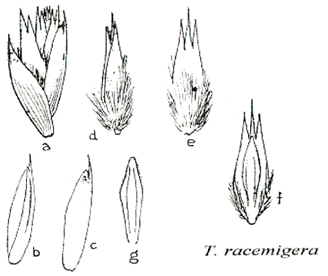 Distinguished by its spiciform racemose panicle; glumes long relative to