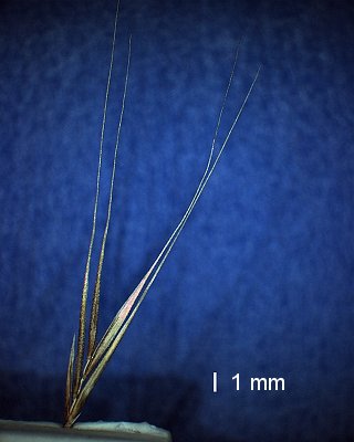 Florets. Fertile lemma 4–7 mm long, without keel, 5 -nerved. Lemma surface glabrous. Lemma apex awned, 1 -awned. Median (principal) awn 5.3–20 mm long overall. Palea 2 -nerved. Palea apex divided to base. Anthers 1(–3).