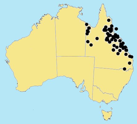 Occurs in tropical N.T. (rare) and tropical