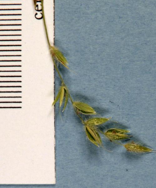 Decumbent stoloniferous perennial. Ascending branches to 40 cm tall, copiously branched with 10–30 nodes. Stolons to c. 0.5 m long. Mid-culm leaf blades 15–30 mm long, 2–4 mm wide; adaxial surface with scattered to moderately dense simple hairs to 0.5–1.6 mm long; abaxial surface with moderately dense simple hairs 1–2 mm long.  Mature fertile leaf sheaths retained, semi-woody, 15–20 mm long, 1.2–1.7 mm wide near base with wall 0.2–0.3 mm thick; tubercle-based hairs 0.7–1.4 mm long between nerves, simple hairs absent; outer margin hairs to 1 mm long. Fertile culm internodes 20–45 mm long. Sterile leaf sheaths with scattered tuberclebased hairs 0.4–1 mm long  nd some simple hairs 0.5–2 mm long. Terminal inflorescences on axes 2–5 cm long, 5–10-flowered. Spikelets 5–6 mm long (without awn), 1.5–2 mm wide; lateral pedicels 0.5–1.5 mm long; ultimate pedicels 3–8 mm long; ultimate spikelets frequently longer than basal spikelets. Lower glume triangular, 0.1–0.5 mm long. Upper glume 5–6 mm long; apex acute. Lower lemma 5–6 mm long; apex acute. Upper lemma body 3–4 mm long, awn to 2.5–4 mm long. Lodicules c. 0.3 mm long. Upper palea 3–4 mm long. Anthers 2.5–2.6 mm long. Caryopsis not seen. Axillary inflorescences enclosed in leaf sheaths within scarcely enlarged basal portion usually present at 3–5 internodes. Spikelets 6–7.5 mm long (without awn), 0.7–0.9 mm wide. Upper glume 0.7–4.5 mm long, apex acute. Lower lemma 6–7.5 mm long. Upper floret subequal to lower. Upper lemma body 6–7.5 mm long, awn 1.5–2.5 mm long. Palea 5.5–6 mm long; acute to shortly awned. Anthers c. 0.6 mm long. Caryopsis cylindrical, 3.8–4 mm long, 0.5–0.6 mm wide.