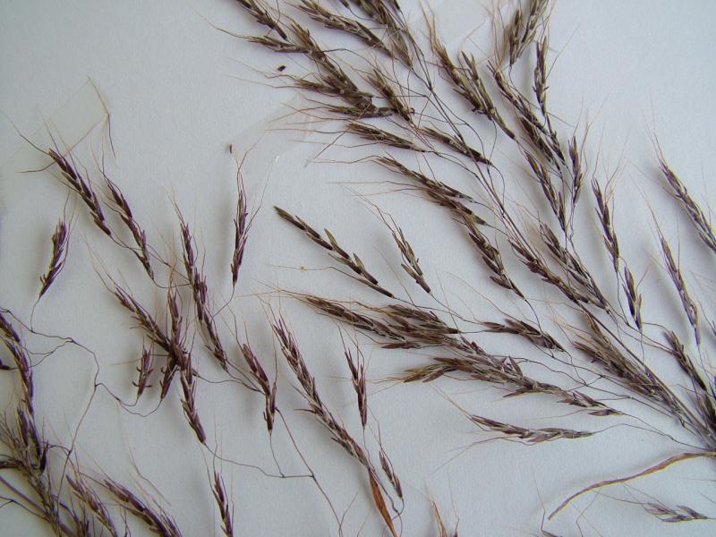 Fertile lemma without keel, 1 -nerved. Lemma apex entire, awned. Median (principal) awn 12–18 mm long overall, with a twisted column. Palea absent. Anthers 3. Grain 1.7–2.8 mm long.
