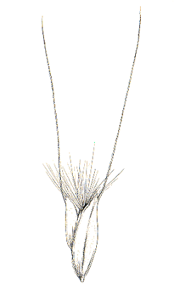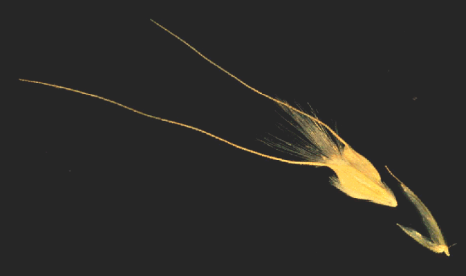 Florets. Fertile lemma 2.5–4 mm long, keeled, 3 -nerved. Lemma apex entire or dentate, awned, 1 -awned. Median (principal) awn subapical, 5–15 mm long overall. Lodicules present. Anthers 3. Grain 1.5–2 mm long.