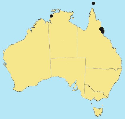 Australian Distribution: Northern Territory, Queensland, Norfolk I, Christmas Is, Cocos Keeling Is, Ashmore Reef, Coral Sea Is.