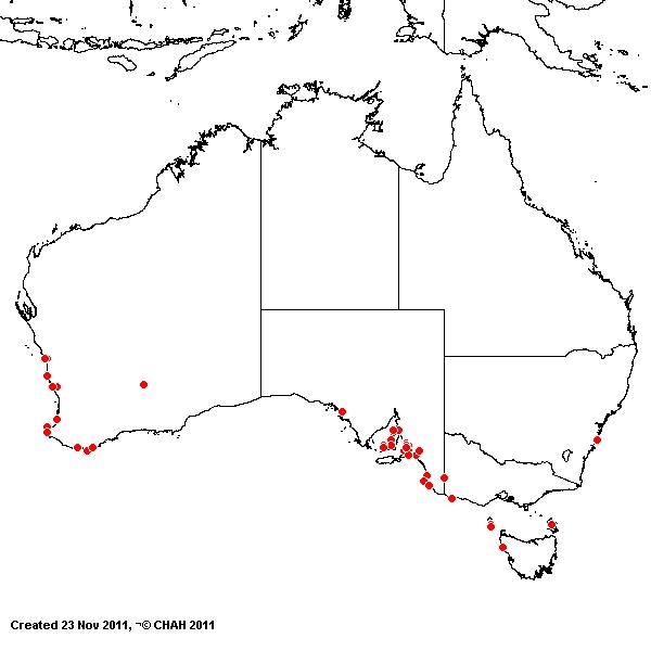 N.S.W., Vic., S.A. and W.A. Native of S Africa. On beach fore dunes. Flowers