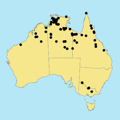 scattered distribution from Port Hedland, W.A., to about Mackay in E Qld, also