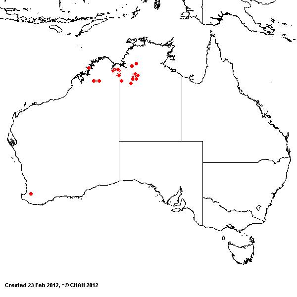 Central and NE Kimberley region of W.A., and N.T. Occurs in skeletal, stony