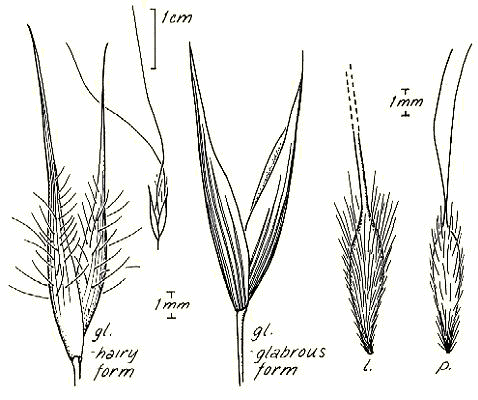 Distinguishing features include loose hairy panicle, long-acuminate awned often