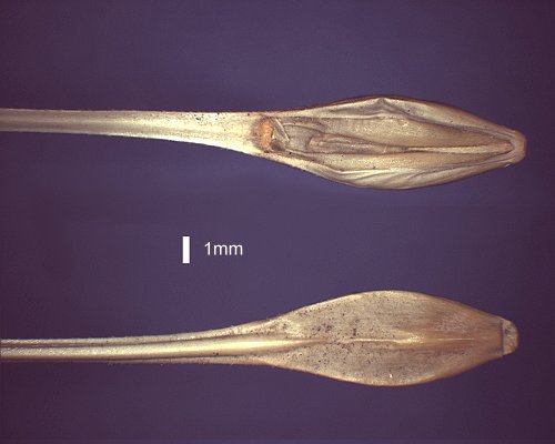 Fertile lemma 5.75–12 mm long, without keel, 5 -nerved. Lemma apex awned, 1
