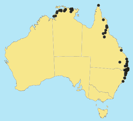 distributed throughout the tropics. Usually in swamps and creeks, waterholes,
