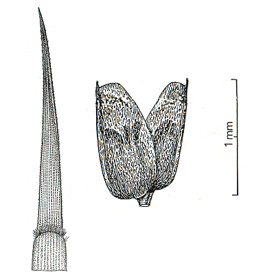 Notes. The pungent spine terminating the blade is a distinctive feature shared only with M. dentata. However, in M. dentata the spine is distinctly longer, the glumes differ markedly in shape and nervation, and the divisions of the panicle are eglandular.