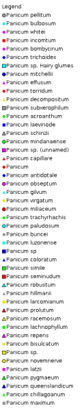 Key references (keys and floras):. G.Bentham, Flora Australiensis 7: 463–491 (incl. Digitaria, Echinochloa) (1878); C.A.Gardner, Flora of Western Australia 1 Gramineae 254–260 (1952); E.E.Henty, Manual Grasses New Guinea 140–144 (1969); J.W.Vickery, Flora of New South Wales, Gramineae 19: 137–138 (1975); M.Lazarides, Tropical Grasses S.E.Asia 126–130 (1980); M.Lazarides, Flora of Central Australia 471–472 (1981); J.C.Tothill and J.B.Hacker, Grasses of Southern Queensland 320–323 (1983); J.P.Jessop, Flora of South Australia 4: 1968–1970(1986); R.D.Webster, Australian Paniceae 118–146 (1987); T.D.Macfarlane, Flora of the Kimberley Region 1195–1196, 1198–1199 (1992); B.K.Simon, Key to Australian Grasses 135–138 (1993); S.W.L.Jacobs and C.A.Wall, Flora of New South Wales 4: 482–489(1993); N.G.Walsh, Flora of Victoria 2: 582–590 (1994); D.I.Morris, Student's Flora of Tasmania 4B: 333–335 (1994); E.Edgar and H.E.Connor, Flora of New Zealand 5: 557–564 (2000); D.Sharp and B.K.Simon, AusGrass (2002); J.P.Jessop, Grasses of South Australia 456–465 (2006); S.W.L.Jacobs, R.D.B.Whalley & D.J.B.Wheeler, Grasses of New South Wales, 4th ed, 312–319 (2008).